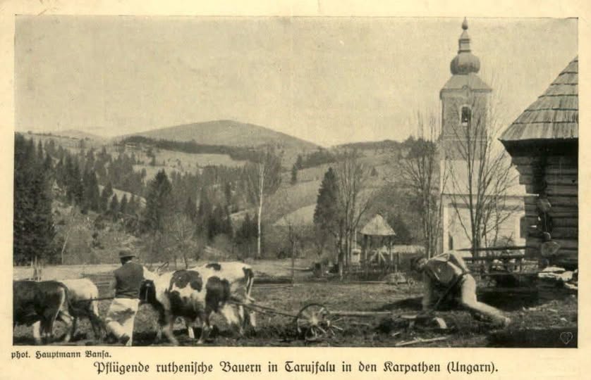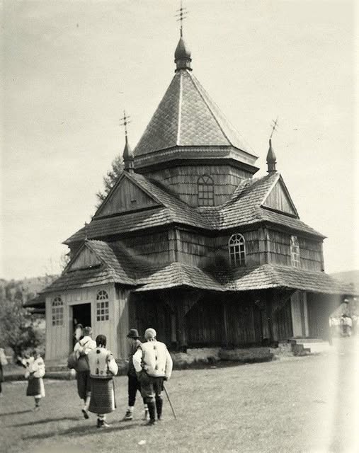 на задньому плані дерев’яна греко-католицька церква Успіння Пресвятої Богородиці (збудована 1810 року).