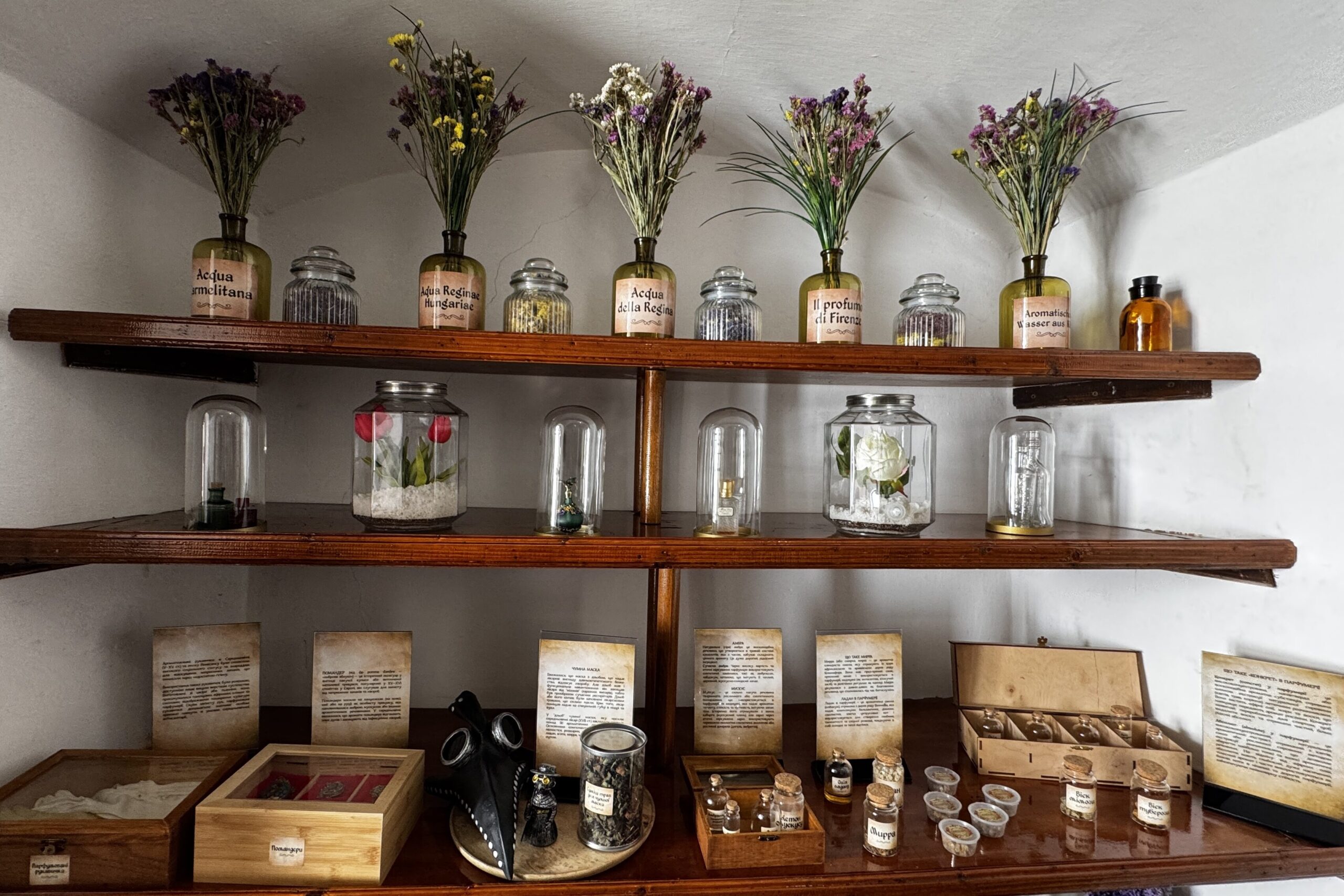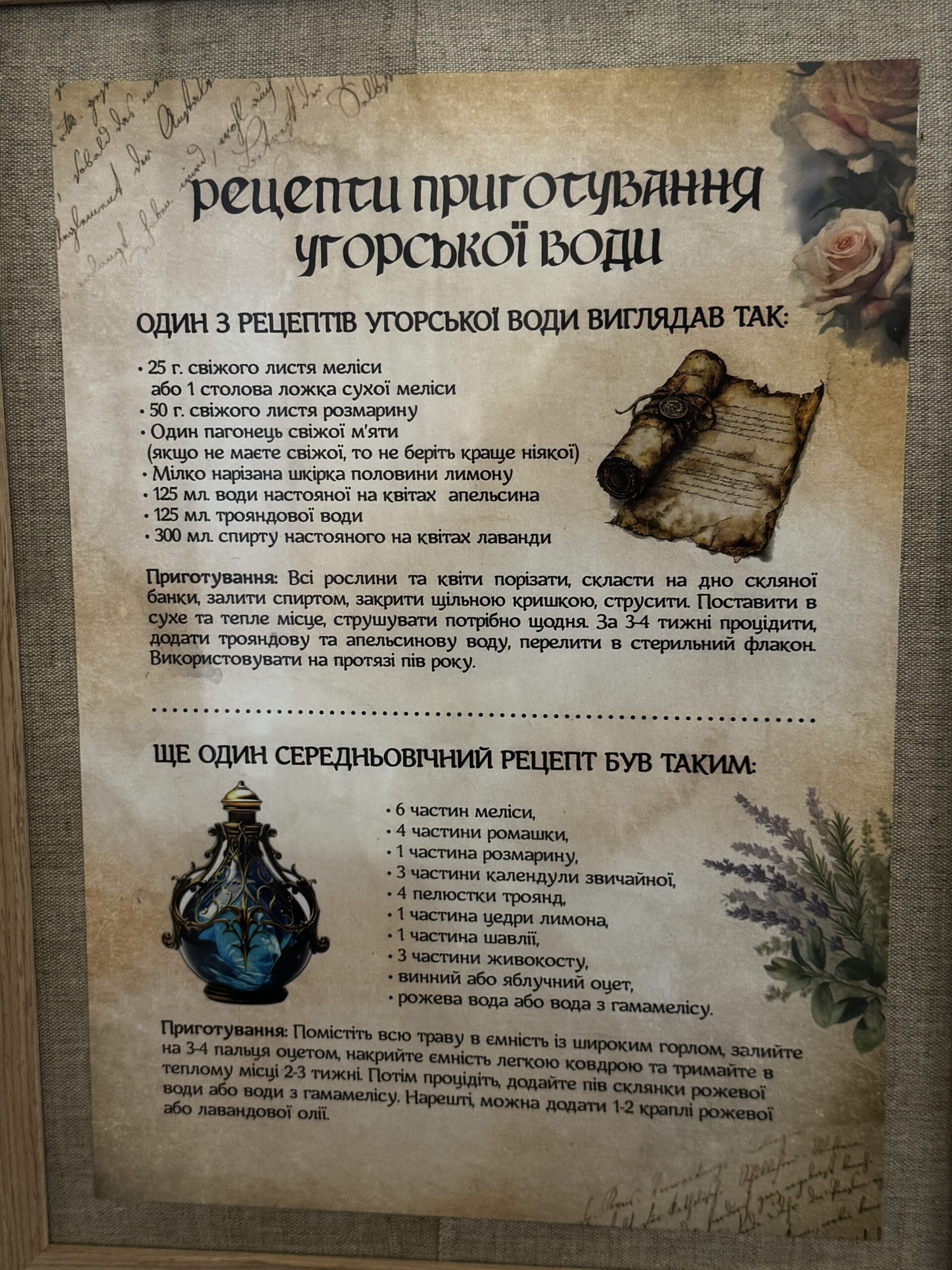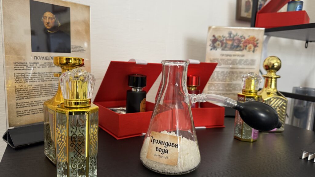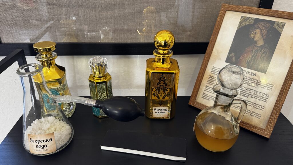 Одним із центральних експонатів стала репліка відомої «Угорської води», історія якої бере початок у 1370 році. За легендою, цей аромат вважали універсальним засобом: його використовували як парфум, косметику та навіть ліки. Саме «Угорській воді» приписують дивовижне омолодження 74-річної угорської королеви, після чого вона нібито отримала пропозицію шлюбу від значно молодшого польського короля.