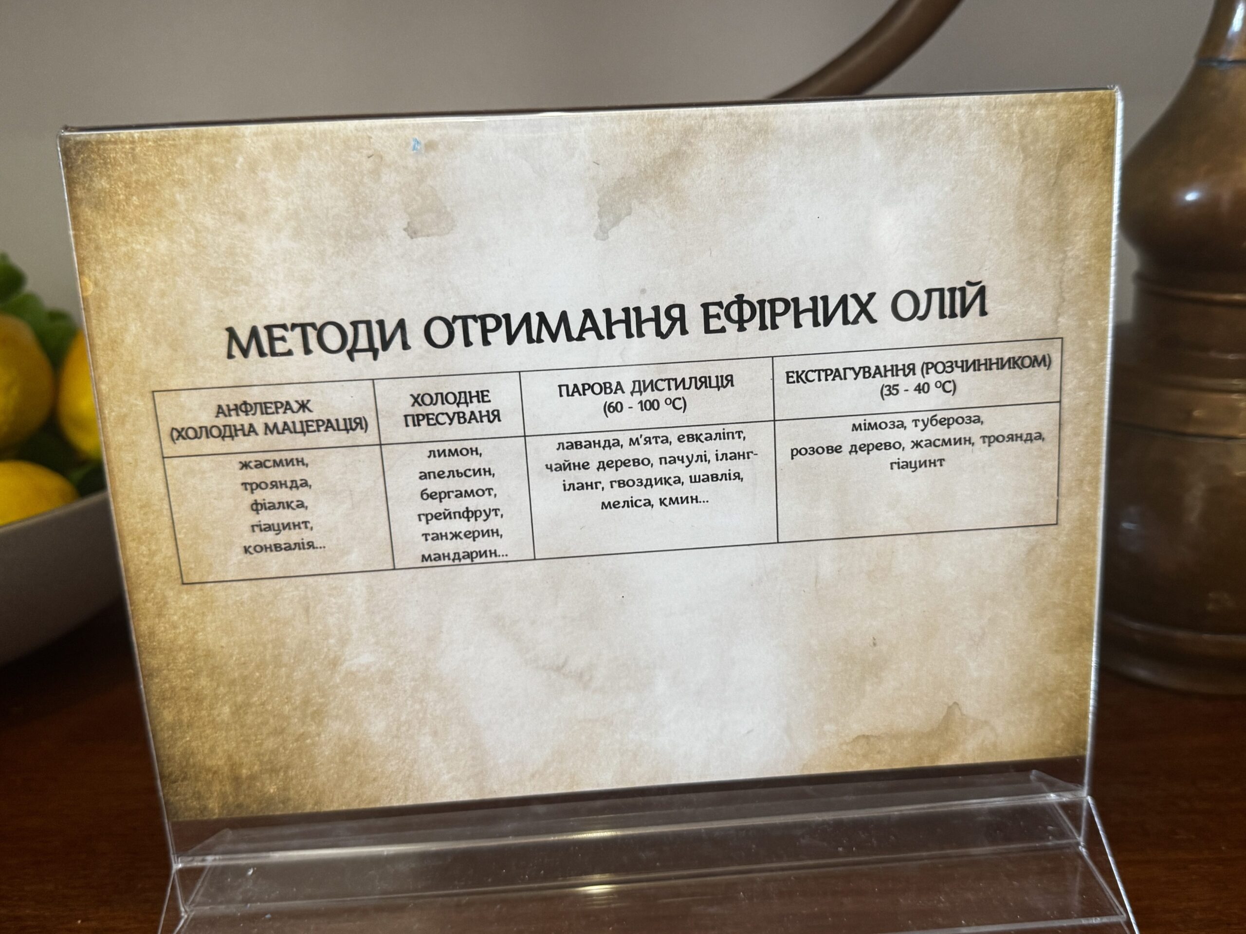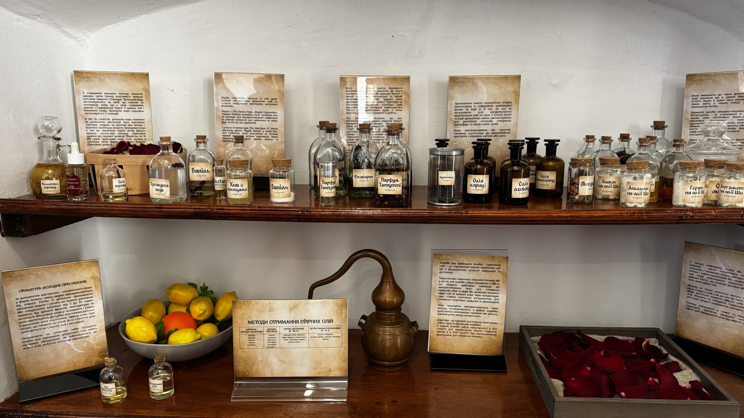 Виставка знайомить не лише з запахами, а й із технологіями їх створення. Відвідувачі можуть побачити старовинні інструменти для дистиляції, дізнатися про походження слова «парфум» – від латинського per fumum («через дим») – та про рідкісні методи отримання ароматів, зокрема холодне пресування цитрусів, яке й сьогодні застосовують у Середземномор’ї.