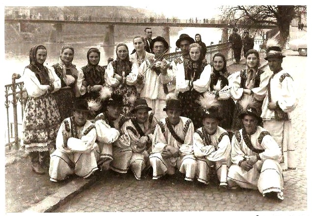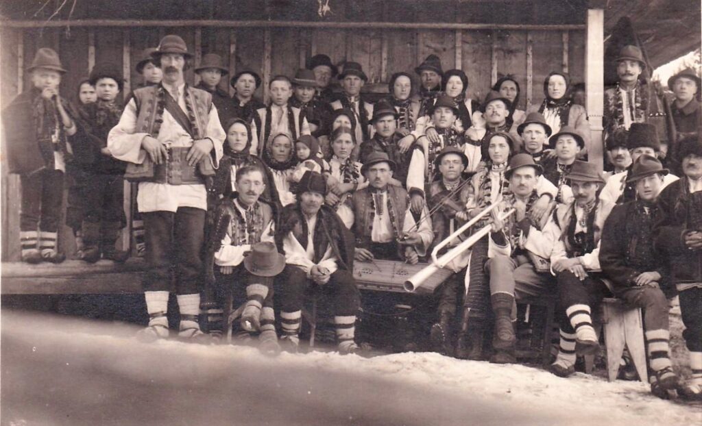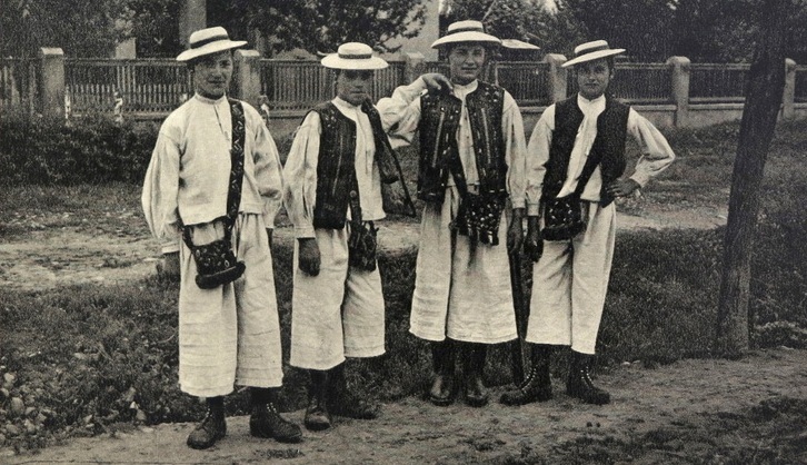 на світлині парубки одягнуті в шкіряні кептарі, крисані, вишиті тайстри (торбини).