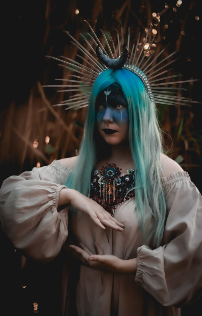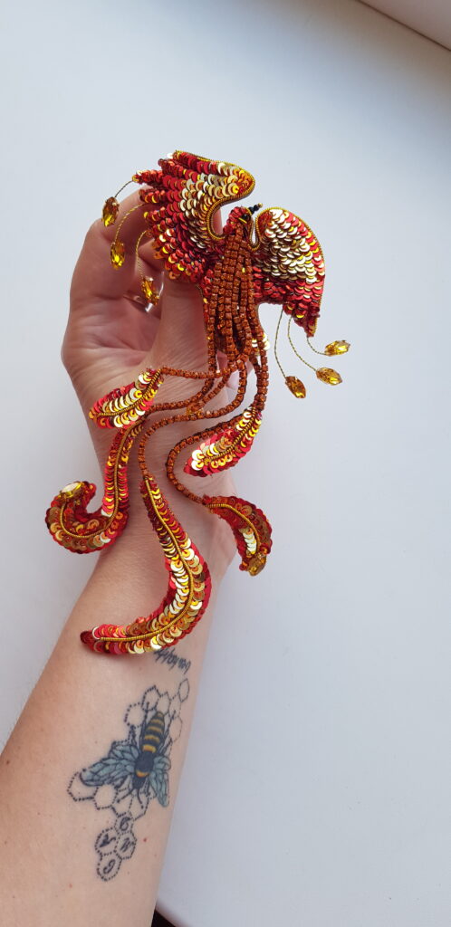 Я співпрацюю з одним онлайн-магазином, і ось вони проводили конкурс на найкращу прикрасу. У її виготовленні треба було обовʼязково використати кристали Swarovski та придумати якусь ідею чи легенду, щоб це було цікаво презентувати. Звичайно, для мене це був крутий творчий виклик. Це був 2014 рік і я лише тоді почала працювати в будинку культури. Розуміла, що можу не виграти, але спробувати дуже хотілося. Я створила ексклюзивне кольє, яке за формою нагадувало пектораль. А загалом це не просто кольє було, в ньому я прям цілу історію розповіла. Придумала легенду про дівчину-фенікса, яка відроджується від кохання і написала її у віршованій формі.