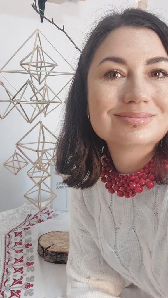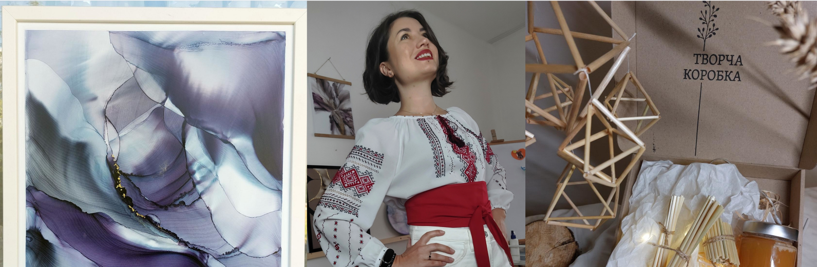 Я з міста Севастополь, що у Криму. У 2014 році, на початку війни в Україні, ми поїхали до Києва, а у 2022 переїхали до Мукачева. Творчістю я займаюся з 2018 року – створюю абстрактні картини з використанням чорнил на спиртовій основі. В Києві мала магазин творчих товарів і збиралася відкрити власну студію. На Закарпатті в мене народився ще один проєкт. Він має назву Творча Коробка. Це набір для творчості для дорослих. Людина отримує Коробку, в якій є матеріал, майстер-клас та вся інша підтримка, щоб створити певний декор. Зараз я просуваю українську стародавню традицію – плетення “павука”.