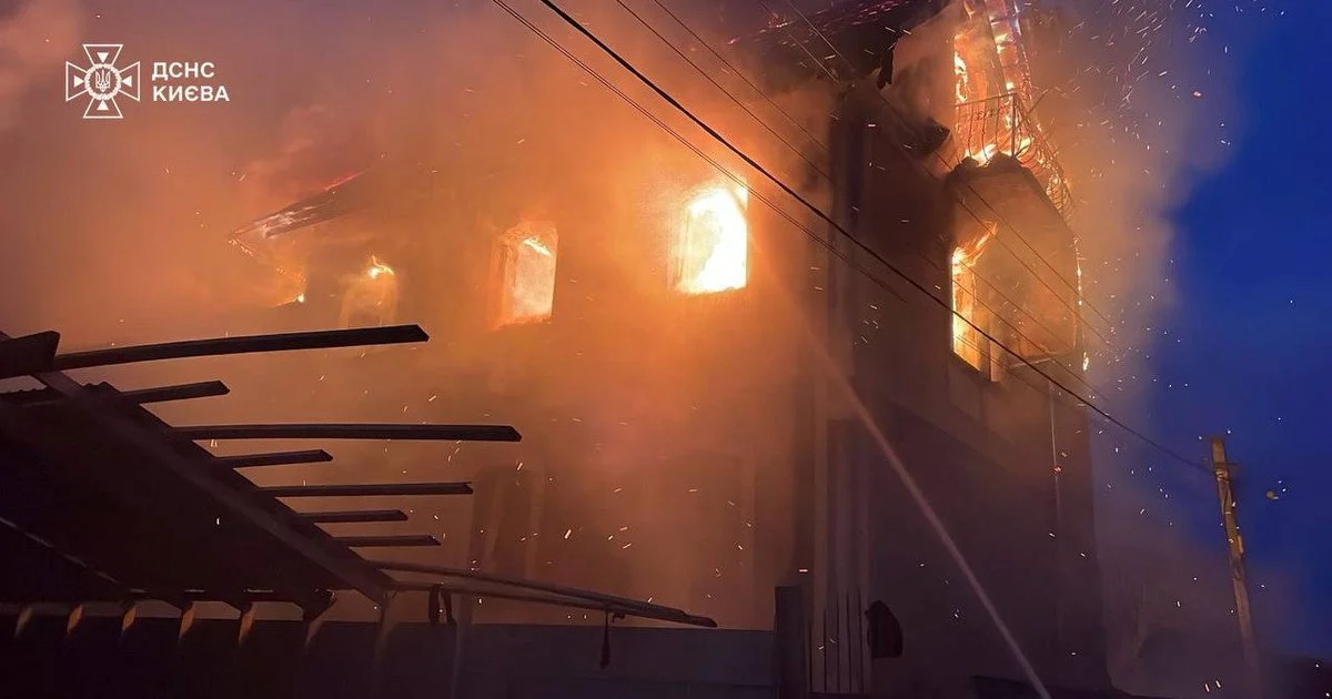 • в Оболонському районі надійшла інформація про пожежу триповерхового приватного житлового будинку через атаку БпЛА. На місці встановлено загоряння даху та другого поверху будинку. Гасіння триває.