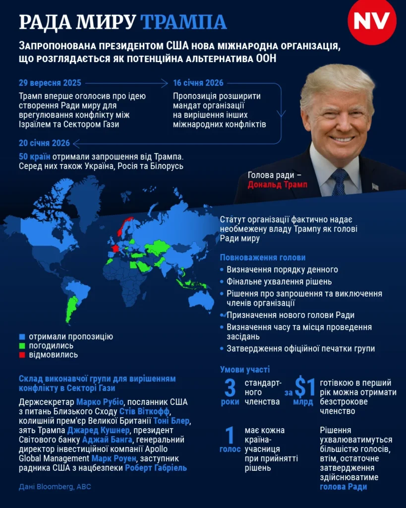 22 січня під час Всесвітнього економічного форуму в Давосі президент США Дональд Трамп провів церемонію, заявлену як започаткування Ради миру — структури під його особистим керівництвом, яку Трамп просуває як альтернативу ООН.
