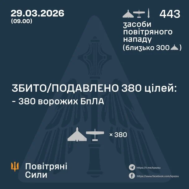 За попередніми даними, станом на 09:00, протиповітряною обороною збито/подавлено 380 ворожих БпЛА типу «Shahed», «Гербера», «Італмас» та дронів інших типів.