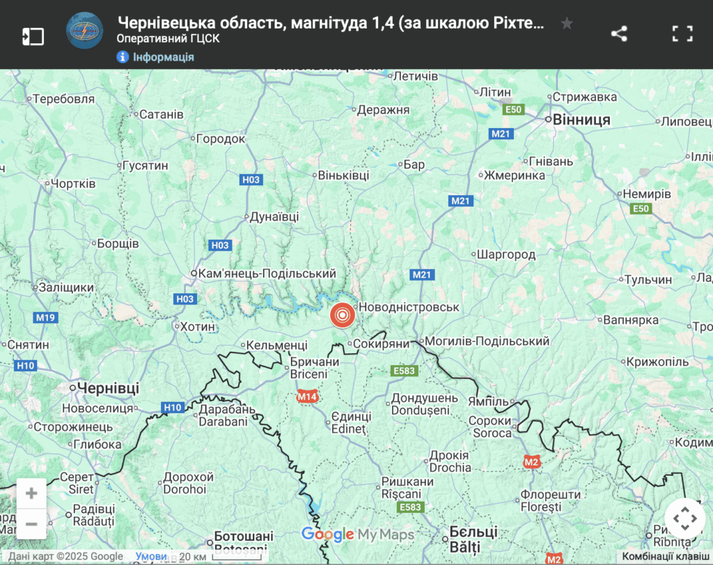 Землетрус магнітудою 1,4 було зареєстровано з території Сокирянської територіальної громади Дністровського району Чернівецької області.