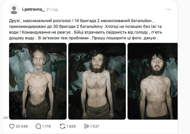 Дружина бійця 14 ОМБр заявила про критичний брак продовольства на передовій: військові втратили до 40 кг ваги, пили дощову воду та подекуди залишалися без їжі до 17 днів через проблеми з логістикою та зв’язком.