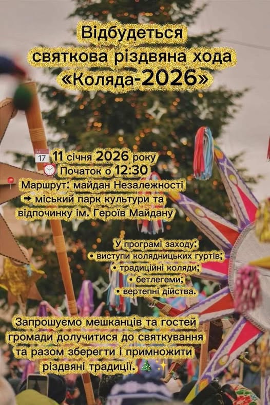 Міська рада запрошує мешканців та гостей громади долучитися до різдвяної ходи, свята, що об’єднає громаду навколо українських різдвяних традицій, духовних цінностей та народних звичаїв.