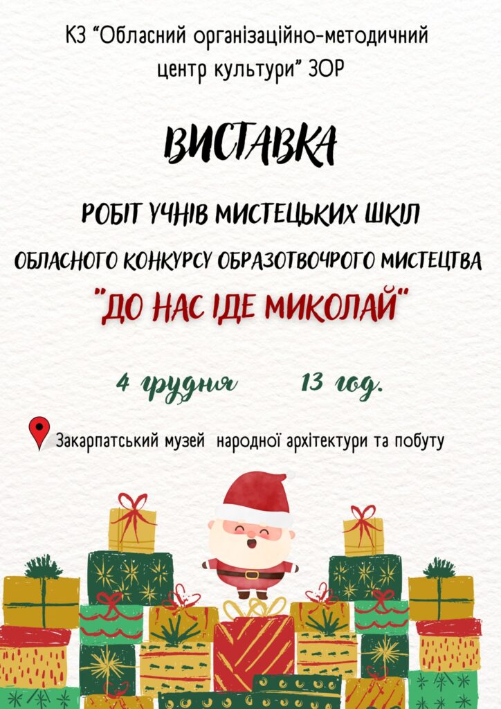 «До нас іде Миколай» під такою символічною назвою 4 грудня у Закарпатському музеї народної архітектури та побуту відкриється обласна виставка-конкурс дитячого малюнка здобувачів освіти мистецьких шкіл Закарпаття.