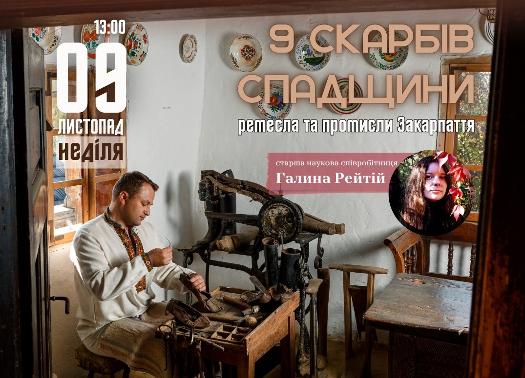 Усе найцінніше — не завжди на видноті. Дев’ять зупинок, дев’ять історій, дев’ять дотиків до мистецтва рук і серця. Запрошуємо культурно збагатитися, завітавши на тематичну екскурсію «9 скарбів спадщини: ремесла та промисли Закарпаття», котрий проведе старша наукова співробітниця Галина Рейтій. Захід присвячено Всеукраїнському дню працівників культури та майстрів народного мистетцва.