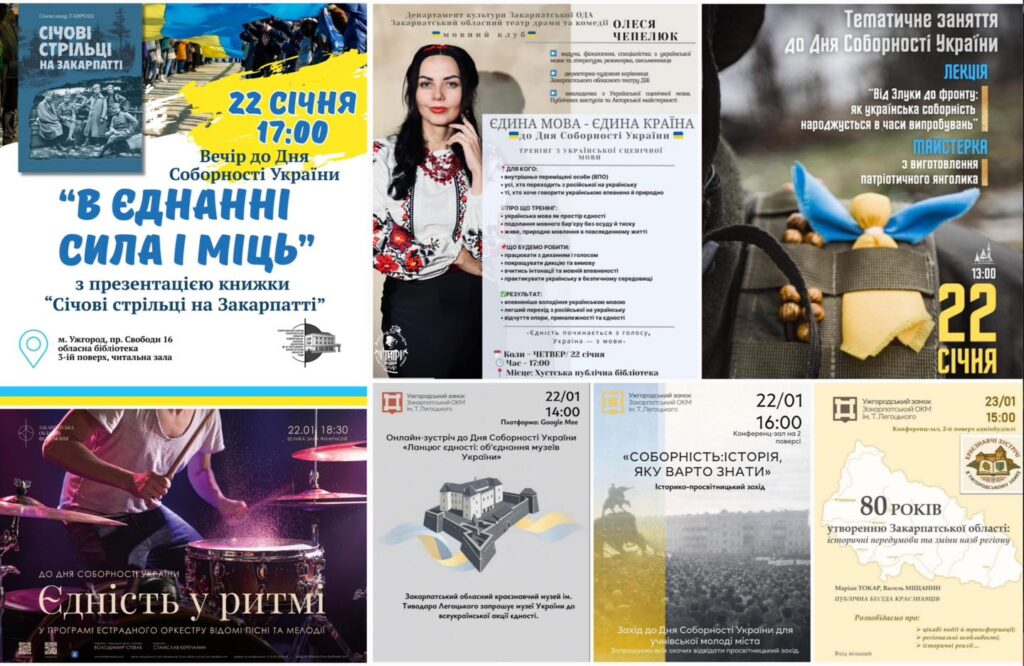З нагоди Дня Соборності обласні заклади культури підготували насичену програму заходів – виставки, лекції, концерти, флешмоби, інтелектуальні змагання та творчі зустрічі. Упродовж кількох днів мешканці та гості краю матимуть змогу долучитися до подій, що популяризують історію України, її культуру та духовні цінності, а також вшановують ідею соборності як фундамент державності.