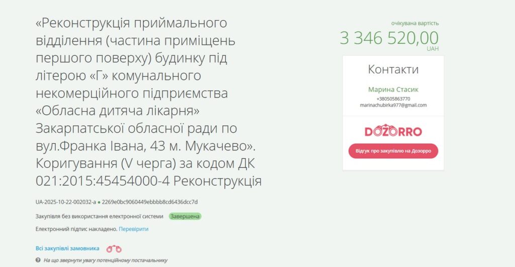 У Мукачево за 3 мільйони 346 тисяч 520 гривень відремонтують приймальне відділення “Обласної дитячої лікарні”. Стартувати роботи мають у жовтні, а завершитися — 31 грудня 2025 року. Переможцем аукціону стало товариство з обмеженою відповідальністю “Браво ліфт”.