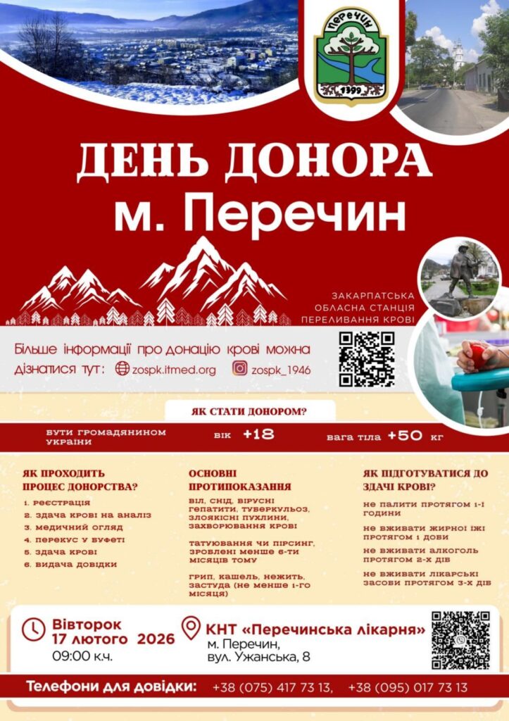 Забір крові відбудеться у вівторок, 17 лютого 2026 року, у КНП «Перечинська лікарня» (1 поверх) за адресою: м. Перечин, вул. Ужанська, 8.