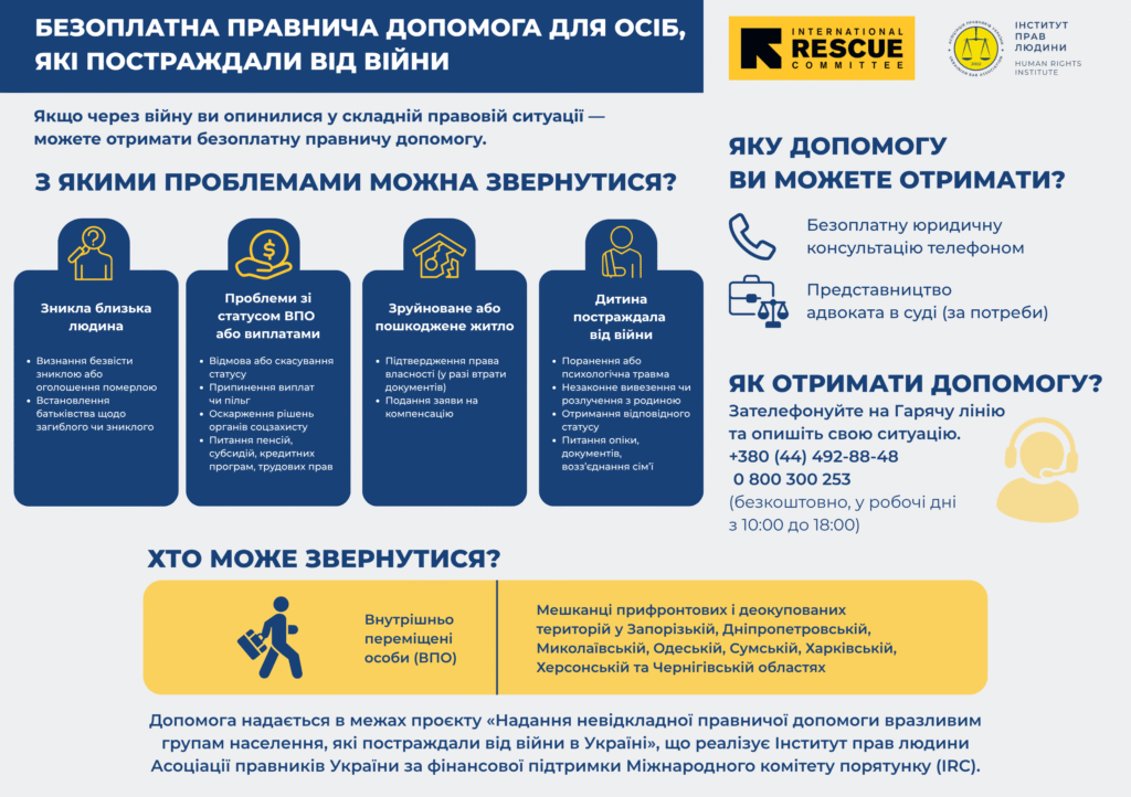 З грудня 2025 року Інститут прав людини Асоціації правників України реалізує масштабний проєкт за підтримки International Rescue Committee, спрямований на надання безоплатної правової допомоги людям, які постраждали внаслідок війни.