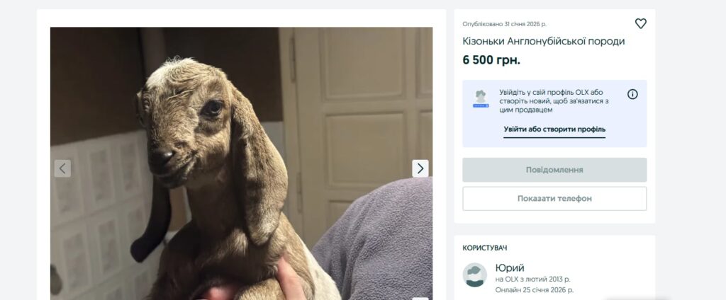 «Бабуся кізоньки завезена з Великобританії з ферми Монах. Насправді дані кози стають повноправними членами сімʼї, окрім смачного унікального молока», – пишуть в оголошенні. Від редакції: Англо-нубійська коза – це британська порода домашніх кіз, яка з’явилася у XIX столітті. Її вивели, схрестивши місцевих британських кіз із великими висловухими козами, яких привезли з Індії, Близького Сходу та Північної Африки. Ці кози легко впізнаються за своїми великими, обвислими вухами та характерним “римським” профілем носа. На відміну від багатьох інших молочних порід, англо-нубійці чудово почуваються в спекотному кліматі та мають довший період розмноження. Сьогодні ця порода поширена по всьому світу і зустрічається у понад шістдесяти країнах.