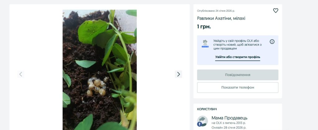 «Зараз маленьких равликів не віддаю, але раз на місяць вони відкладають яйця, можу віддати яйцями, або за попередньої домовленості, і напевно, по передплаті – 100 грн вирощу для Вас малечу. Проконсультую, скину потрібну інформацію не вибагливі. Може комусь цікаво виростити у себе, з крихіток або яєць», – зауважує продавець.