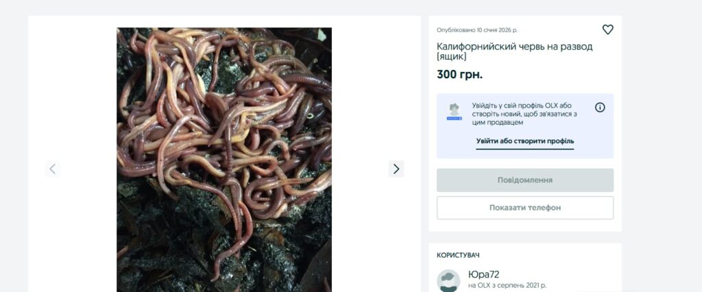 «Продаємо каліфорнійських хробаків, які стануть чудовим переробником ваших органічних відходів. ціна вказана за сім’ю = великі + малеча + кокони», – зауважують в повідомленні.