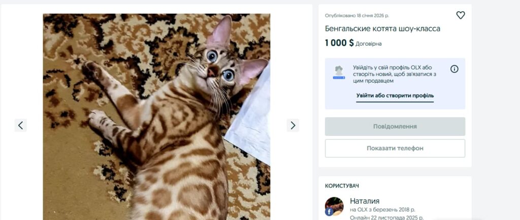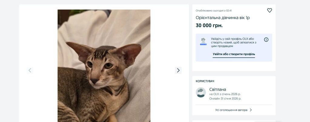 «Продам кішечку орієнтальної породи чистокровна не кастрована, дуже вихована грайлива енергійна», – пише продавець.