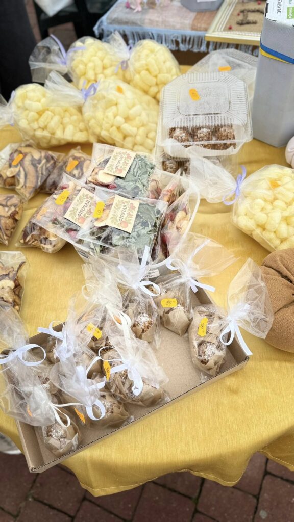 На ярмарку можна було знайти вироби ручної роботи, крафтову продукцію, різноманітні вина, сири, запашну випічку, домашні ковбаси, теплі напої та інші смаколики.