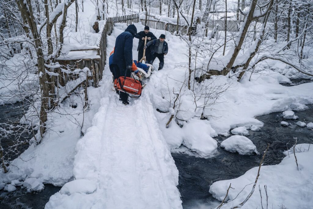 На місці стан чоловіка був важким: кровотечу вдалося зупинити, однак показники сатурації та артеріального тиску залишалися критично низькими, також виникла підозра на пневмонію. Після надання невідкладної допомоги медики разом із родичами та сусідами транспортували пацієнта санчатами до карети швидкої.