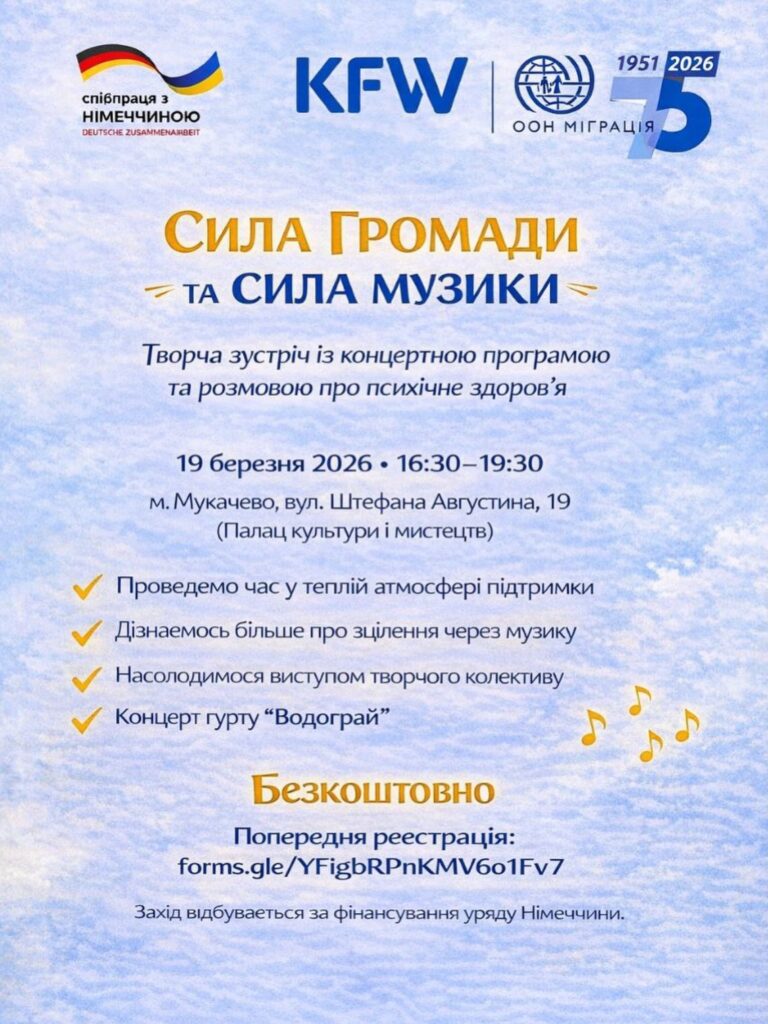 Міжнародна організація з міграції запрошує мешканців Мукачівської громади на інформаційно-культурну зустріч, присвячену темі психічного здоров’я та підтримки.