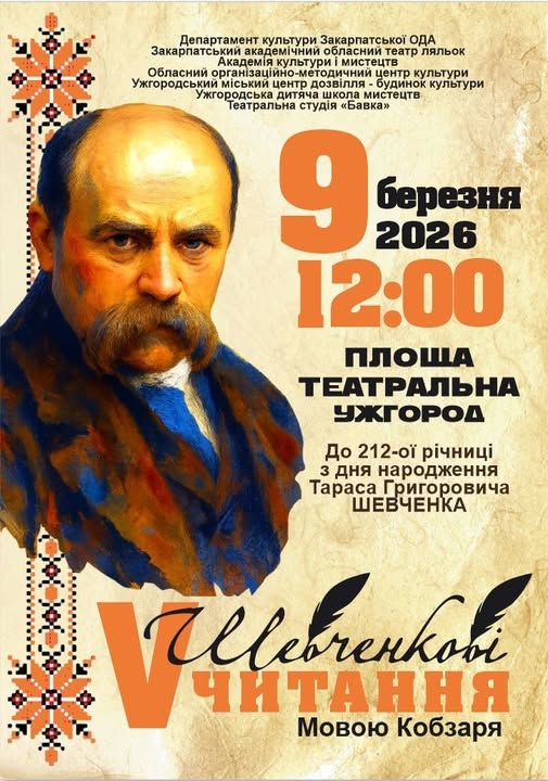 З нагоди 212-ї річниці від дня народження Тарас Шевченко в центрі Ужгорода відбудеться поетичний марафон «Шевченкові читання. Мовою Кобзаря». Захід пройде 9 березня та об’єднає всіх, хто прагне вшанувати пам’ять українського Генія живим словом його поезії.