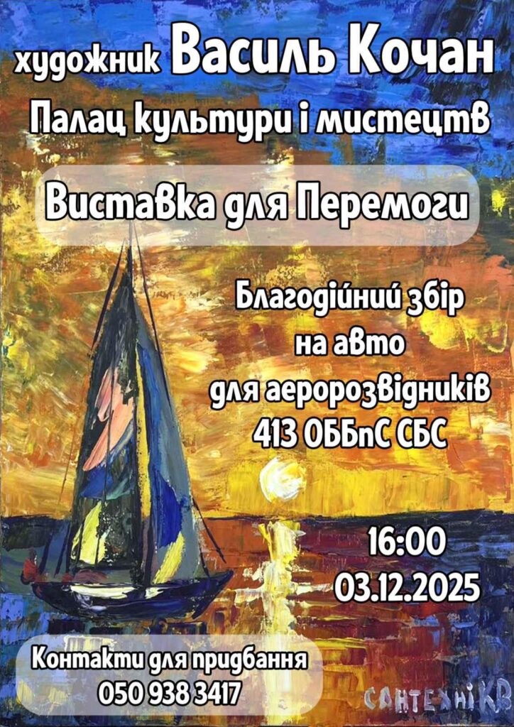3 грудня о 16:00 в Мукачеві у Палаці культури і мистецтв відбудеться благодійна виставка Василя Кочана «Виставка для Перемоги». Захід поєднує мистецтво та добру справу — усі зібрані кошти підуть на придбання автомобіля для аеророзвідників 413 ОБпС СБС.