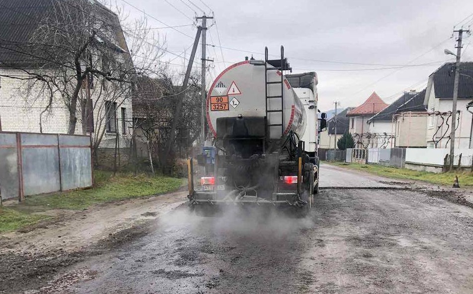 Підрядна організація Служби місцевих автомобільних доріг та розвитку інфраструктури у Закарпатській області виконує влаштування нового асфальтобетонного покриття. Наразі проведено фрезерування зношеного шару, здійснюється проливка бітумною емульсією та укладання нового асфальту.