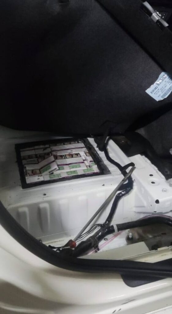 В автівці знайшли 1850 пачок цигарок без марок акцизного податку України, які лежали в ніші для акумуляторної батареї під сидіннями водія і пасажира.