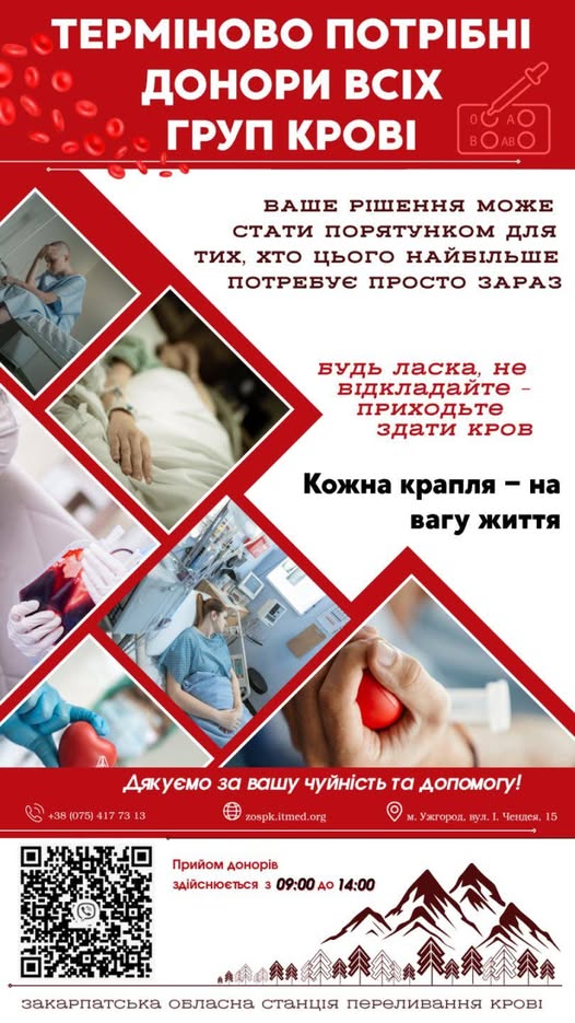 Терміново потрібна кров! Прохання донорів усіх груп долучитися до здачі крові.