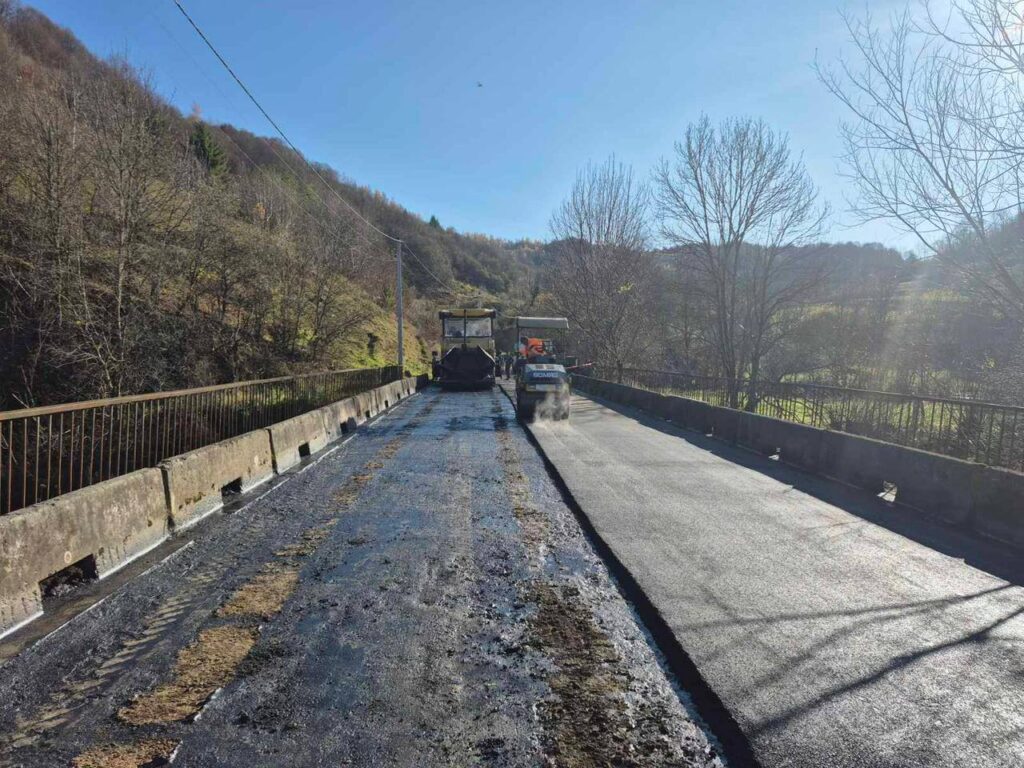 На фото видно, що ремонт охоплює мостовий перехід через гірський потік — тут укладають новий шар асфальтобетонного покриття, ущільнюють його катками та вирівнюють основу.