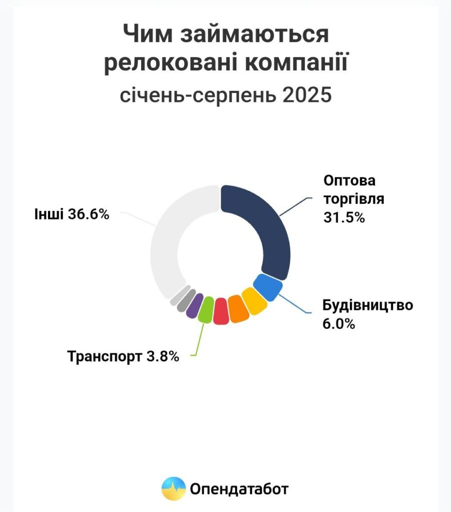 Аналітика зазначають, найчастіше переїжджають компанії, що працюють у сфері торгівлі. Також часто переїжджає бізнес у сфері будівництва (6%), сільського господарства (5%) та нерухомості (5%). Майже 8 тисяч компаній релокувались по Україні за 8 місяців 2025 року за даними Єдиного державного реєстру. Кількість переїздів стабілізувалась й навіть стала меншою, ніж до початку повномасштабного вторгнення. Найпопулярнішим регіоном, звідки та куди переїжджає бізнес, залишається Київ.