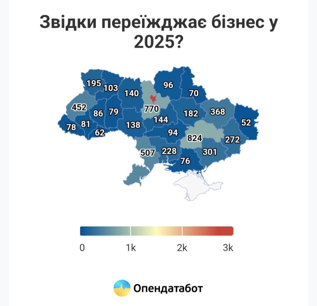 «Більшість бізнесів переїжджає за маршрутом до та з Києва. Основними напрямками переміщення бізнесу залишаються маршрути між Києвом та областями. Найпопулярнішими стали переїзди зі столиці до Київської області (494 компанії), до Дніпропетровської області (379), а також у зворотному напрямку: з Київської області до столиці (378). На Харківщину з Києва переїхали 358 компаній, тоді як з Дніпропетровщини до столиці — 336», – повідомляє Опендатабот.