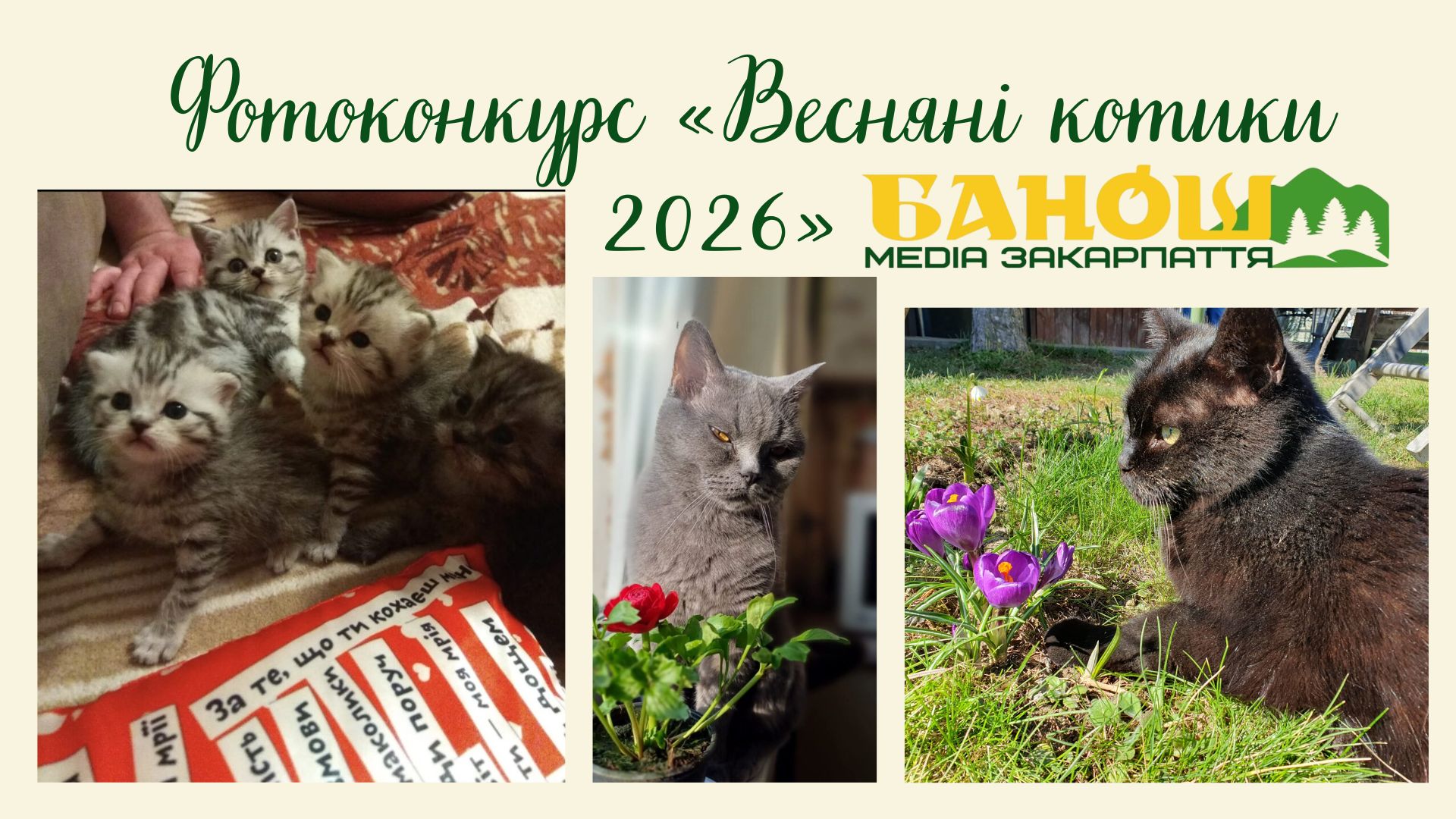 Фотоконкурс «Весняні котики 2026», організований медіа «Банош», набирає обертів! Усі охочі ще мають час долучитися — надсилайте світлини своїх пухнастих улюбленців і змагайтеся за приємні подарунки.