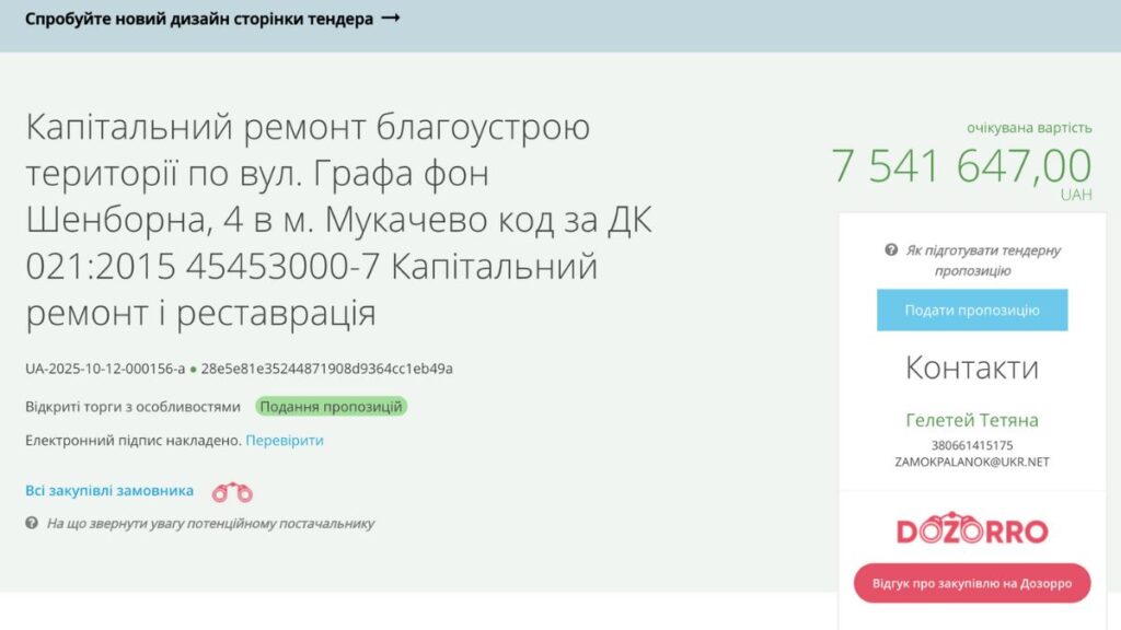 У Мукачево збирають провести капремонт території біля будинку №4 на вулиці Графа фон Шенборна. Відповідний тендер оголосив Мукачівській історичний музей. На роботи готові виділити 7 мільйонів 541 тисячу 647 гривень. Модернізувати благоустрій мають до 28 лютого 2026 року.