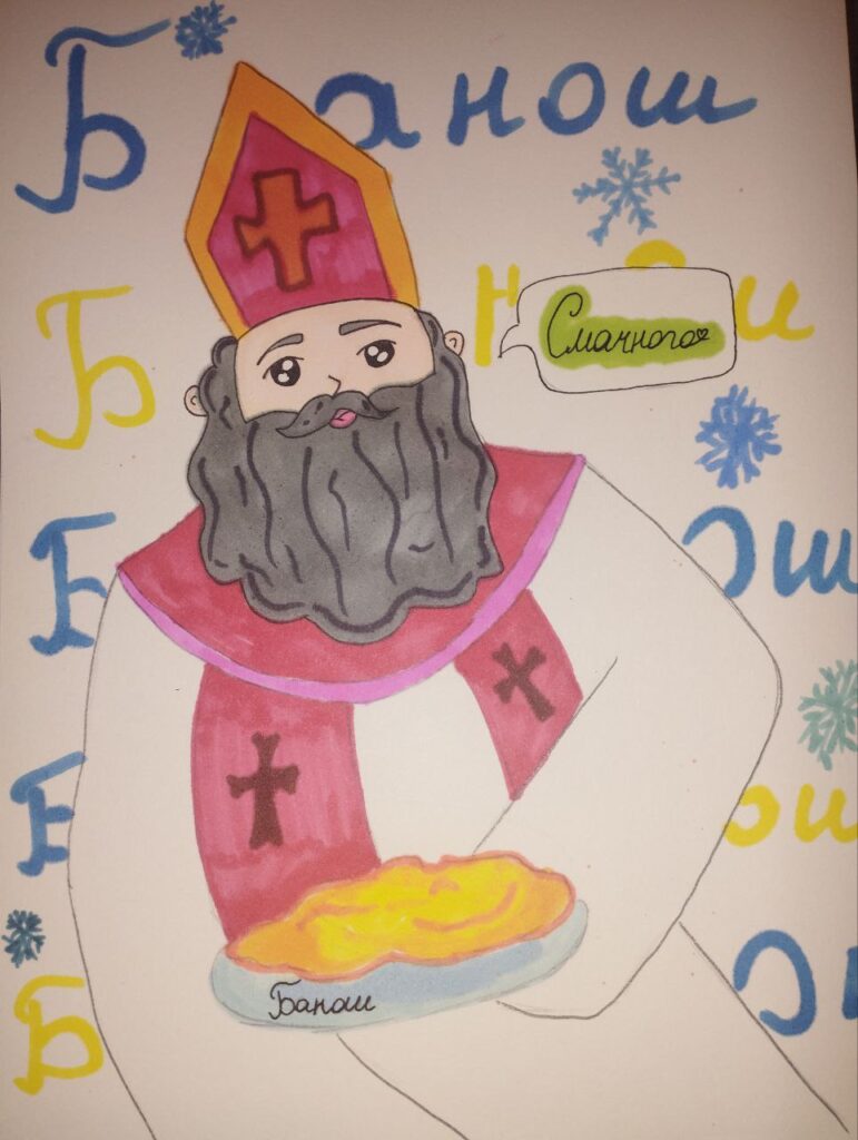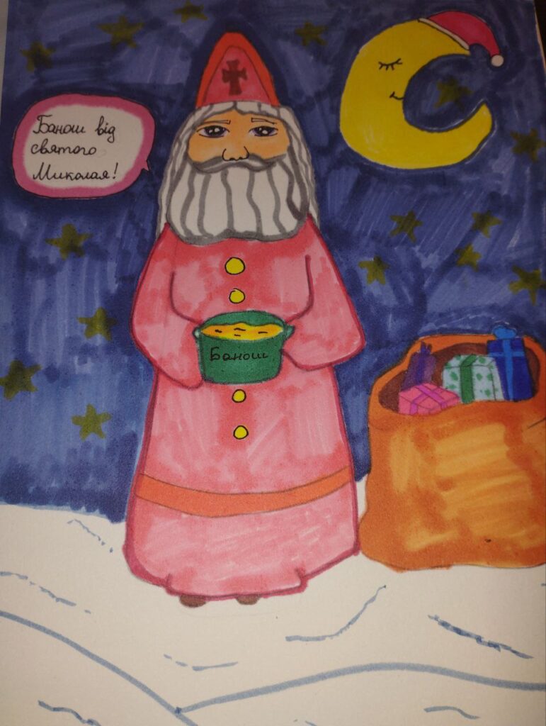 Юні художники з ентузіазмом поринули у атмосферу зимових свят та почали створювати власні казкові історії, де поруч із Святим Миколаєм, яскравими вогниками та зимовою магією обов’язково присутній ароматний банош.
