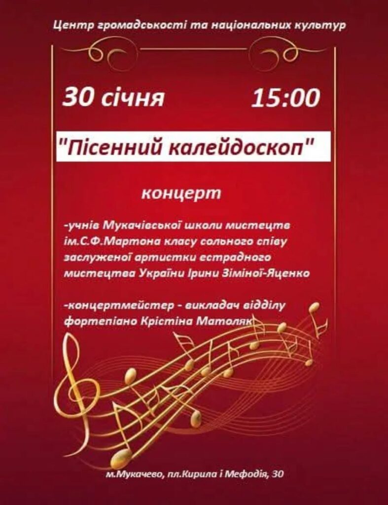 30 січня о 15:00 у Центрі громадськості та національних культур в Мукачеві відбудеться концерт юних вокалістів під назвою «Пісенний калейдоскоп».