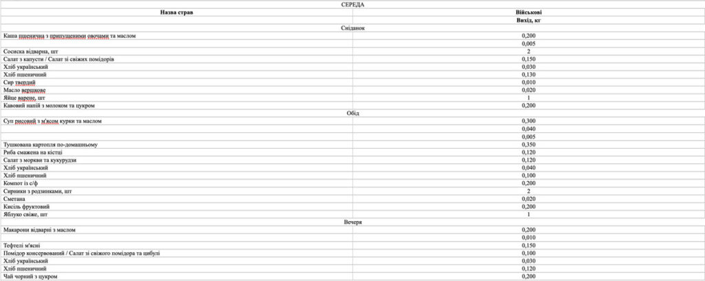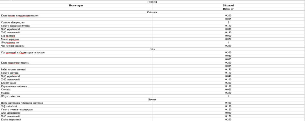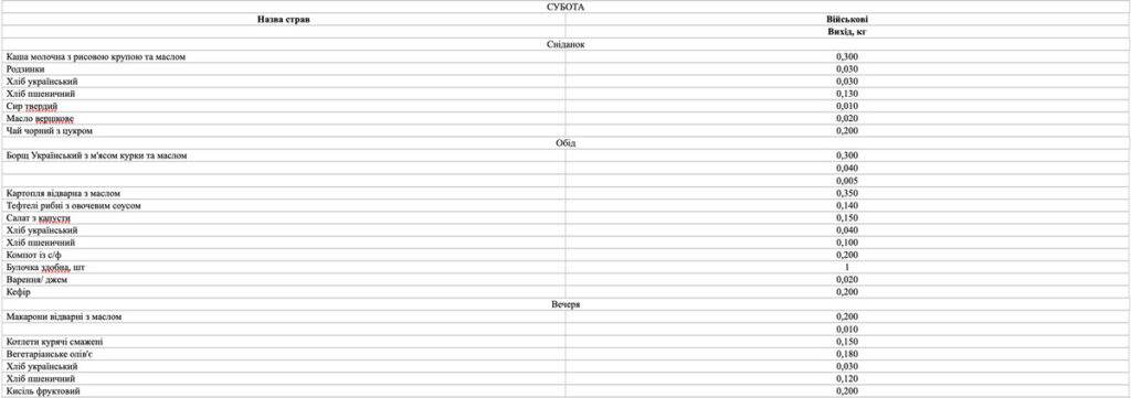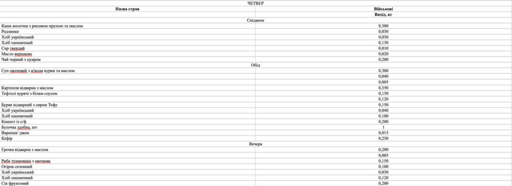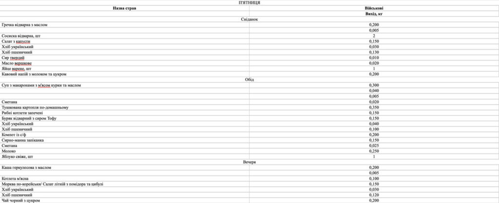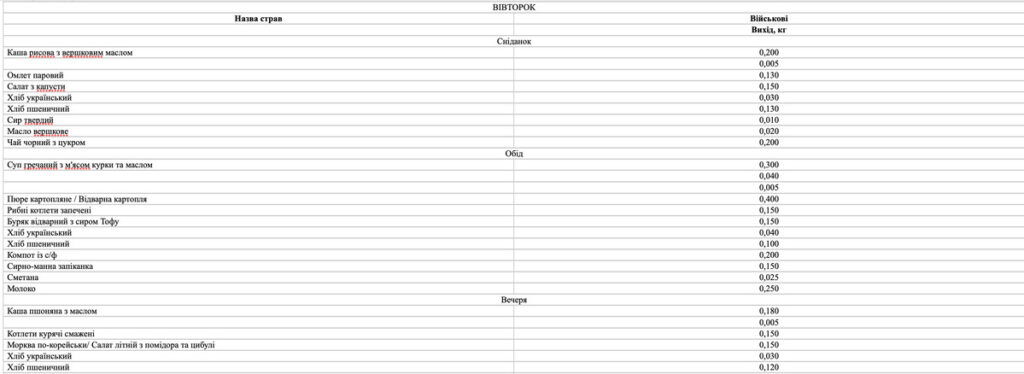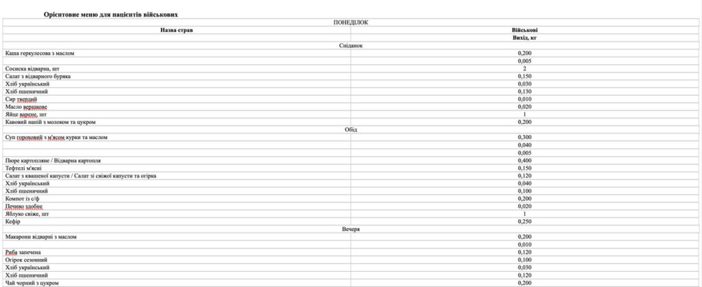 Окрім того, меню має відповідати вимогам наказу МОЗ України № 931 від 29.10.2013 р. «Про удосконалення лікувального харчування та роботи дієтологічної системи в Україні», а для військових – норми № 5 (Постанова КМУ № 426 від 29.03.2002 р.).