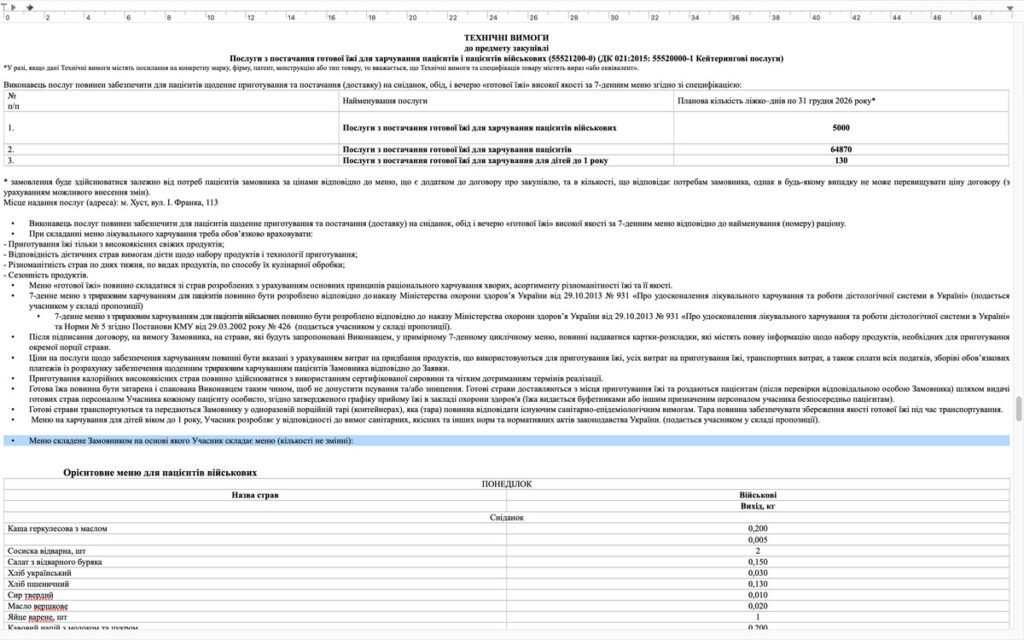 Згідно з технічним завданням, постачальник має щодня готувати та привозити триразове харчування для пацієнтів – сніданок, обід та вечерю – за 7-денним меню. Продукти мають бути якісними, а раціон – збалансованим.