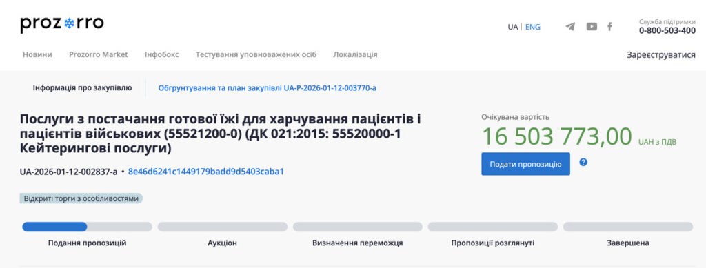 12 січня Хустська центральна лікарня ім. Віцинського оголосила тендер на постачання харчування для пацієнтів та військових. На це готові виділити 16 мільйонів 503 тисячі 733 гривні. Строк постачання – до 31 грудня 2026 року.