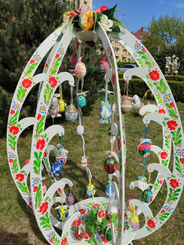 Дерева прикрасили підвішеними писанками, а поруч встановили великі декоративні об’єкти з яскравими візерунками. Є й кілька тематичних інсталяцій, які доповнюють загальну композицію та задають святковий настрій.