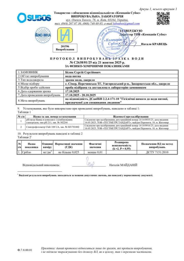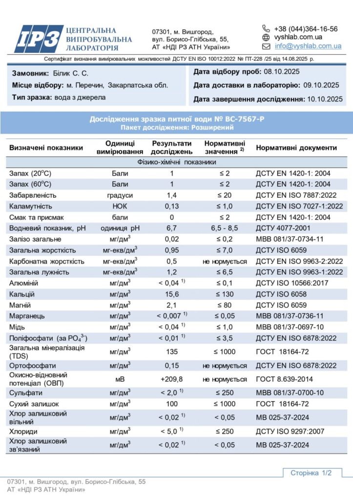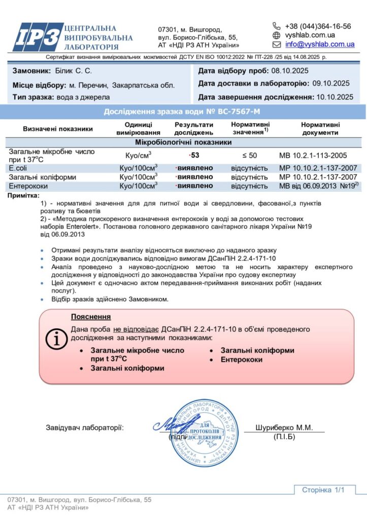 Кілька тижнів тому громадська організація «НАШ ДІМ – ПЕРЕЧИН» ініціювала перевірку якості води зі Срібного джерела. Зразки тоді відібрали з правої труби та відправили до однієї з провідних українських лабораторій.