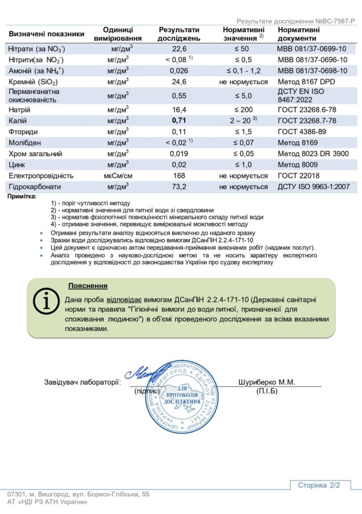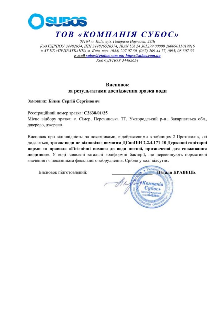 У висновку лабораторії зазначено, що зразок води не відповідає вимогам ДСанПіН 2.2.4.171-10 «Гігієнічні вимоги до води питної, призначеної для споживання людиною».