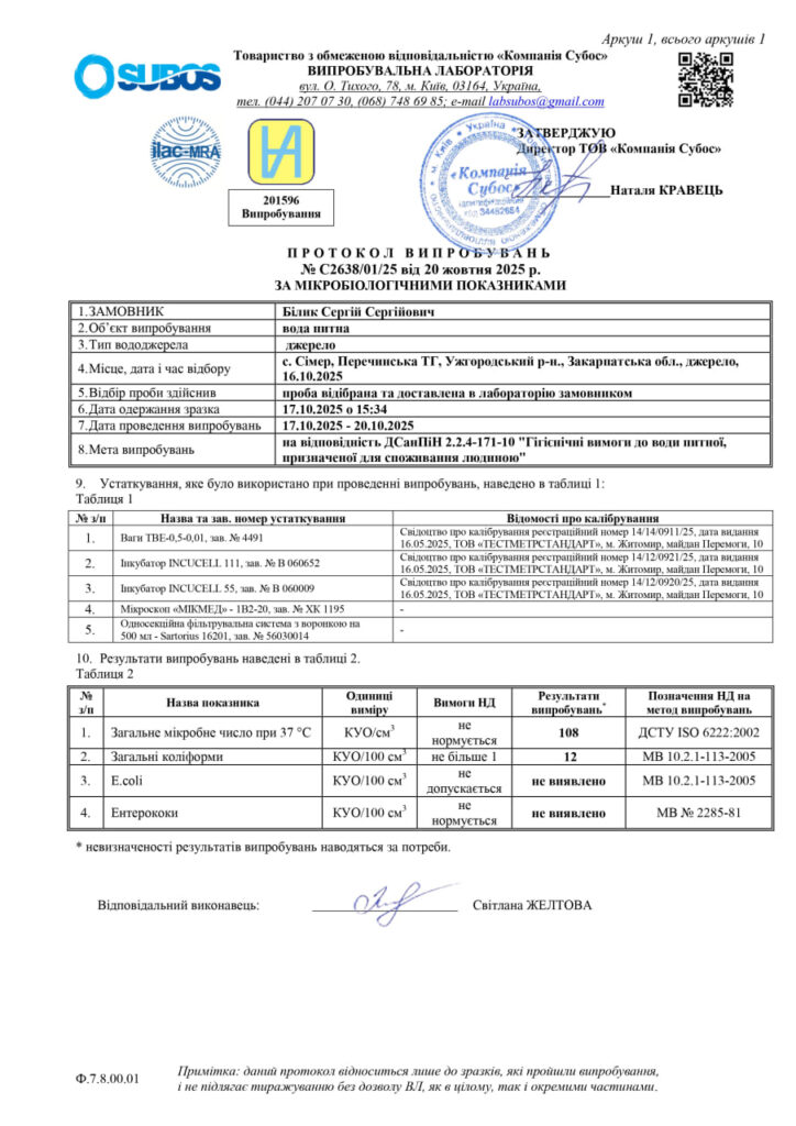 • Мікробіологічний аналіз показав наявність загальних коліформних бактерій, кількість яких перевищує допустимі норми. Це свідчить про фекальне забруднення води.