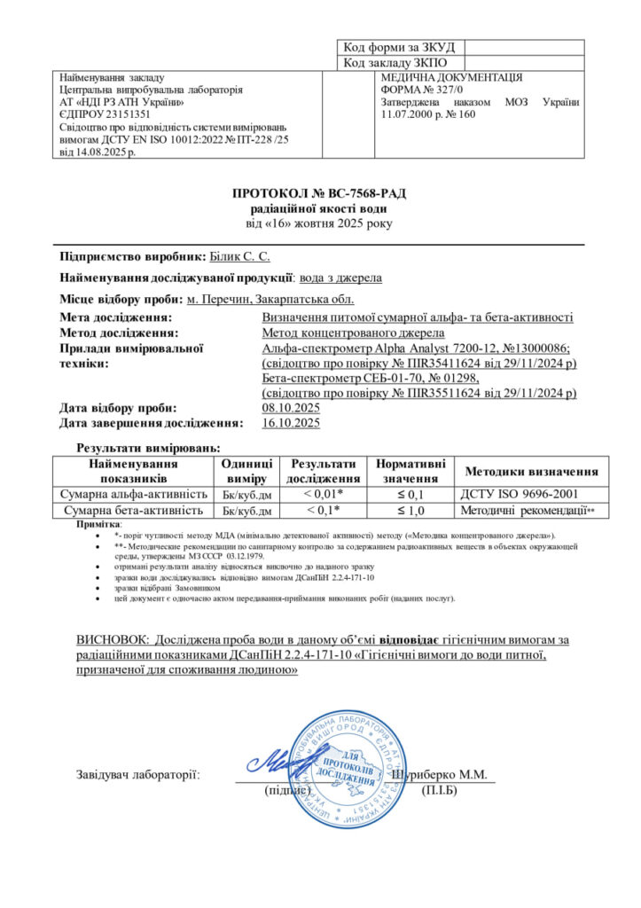 За результатами дослідження, фізико-хімічні та радіологічні показники води відповідали нормам, однак мікробіологічний аналіз виявив відхилення — вода не відповідала санітарним вимогам і була визнана непридатною для пиття.