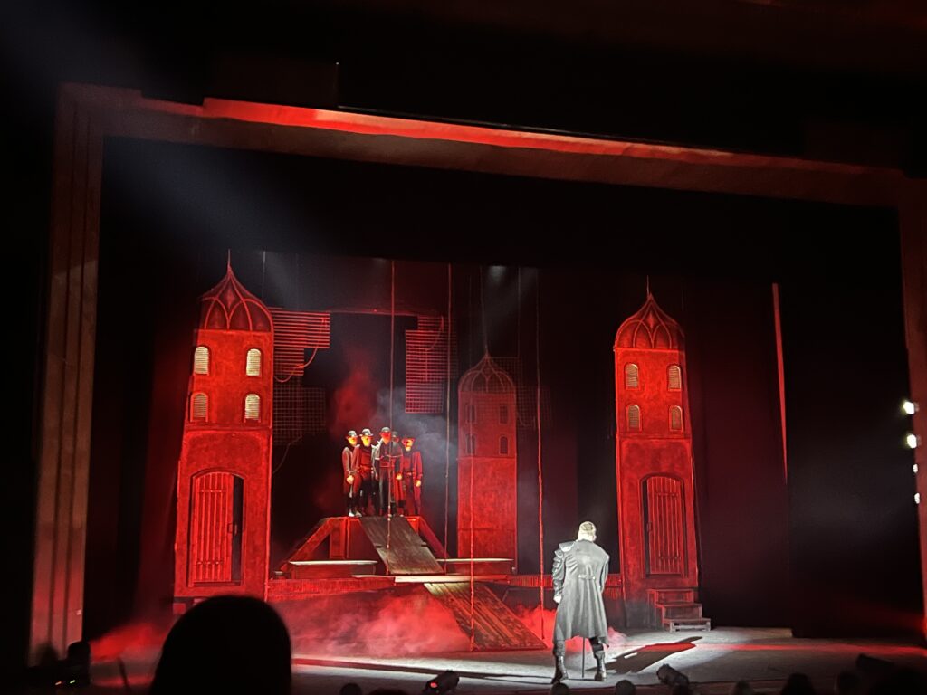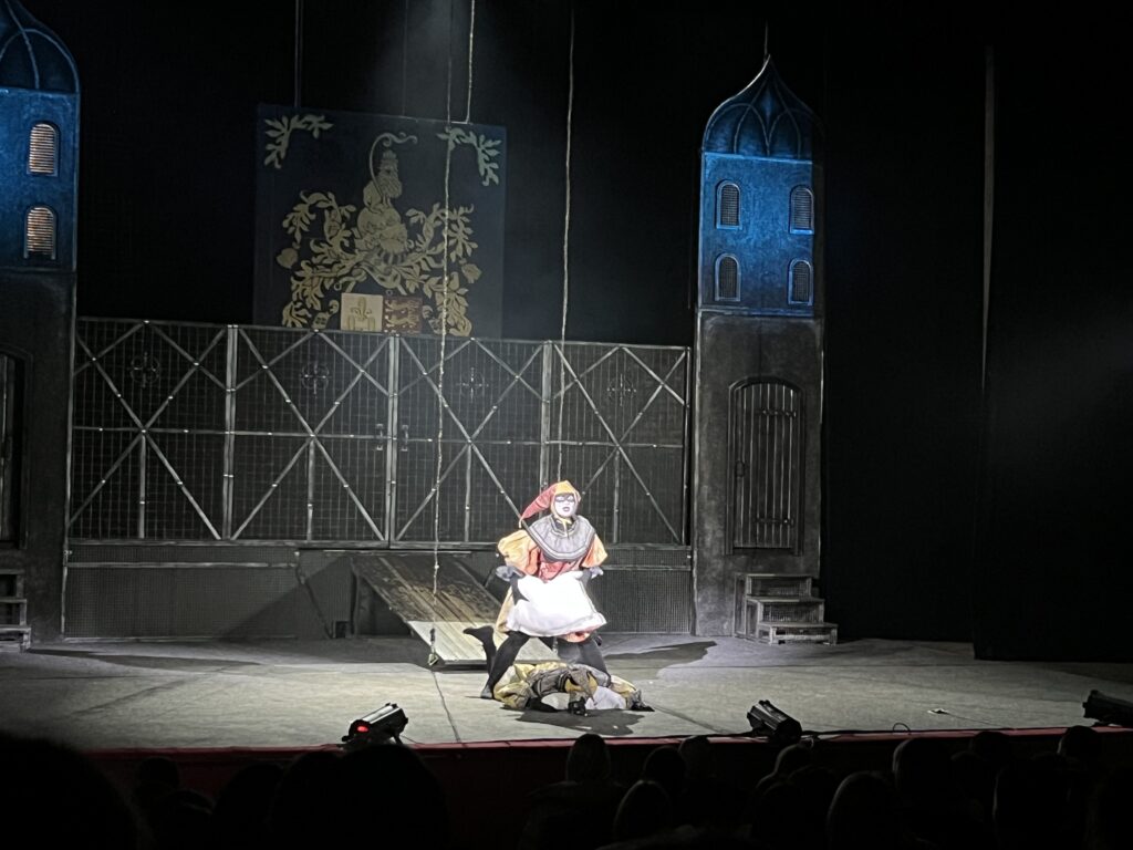 Декорації та костюми створюють похмурий світ королівського двору, де страх і напруга відчуваються у кожній сцені. Простір сцени постійно працює з акторами, підкреслюючи конфлікти та психологічний тиск.