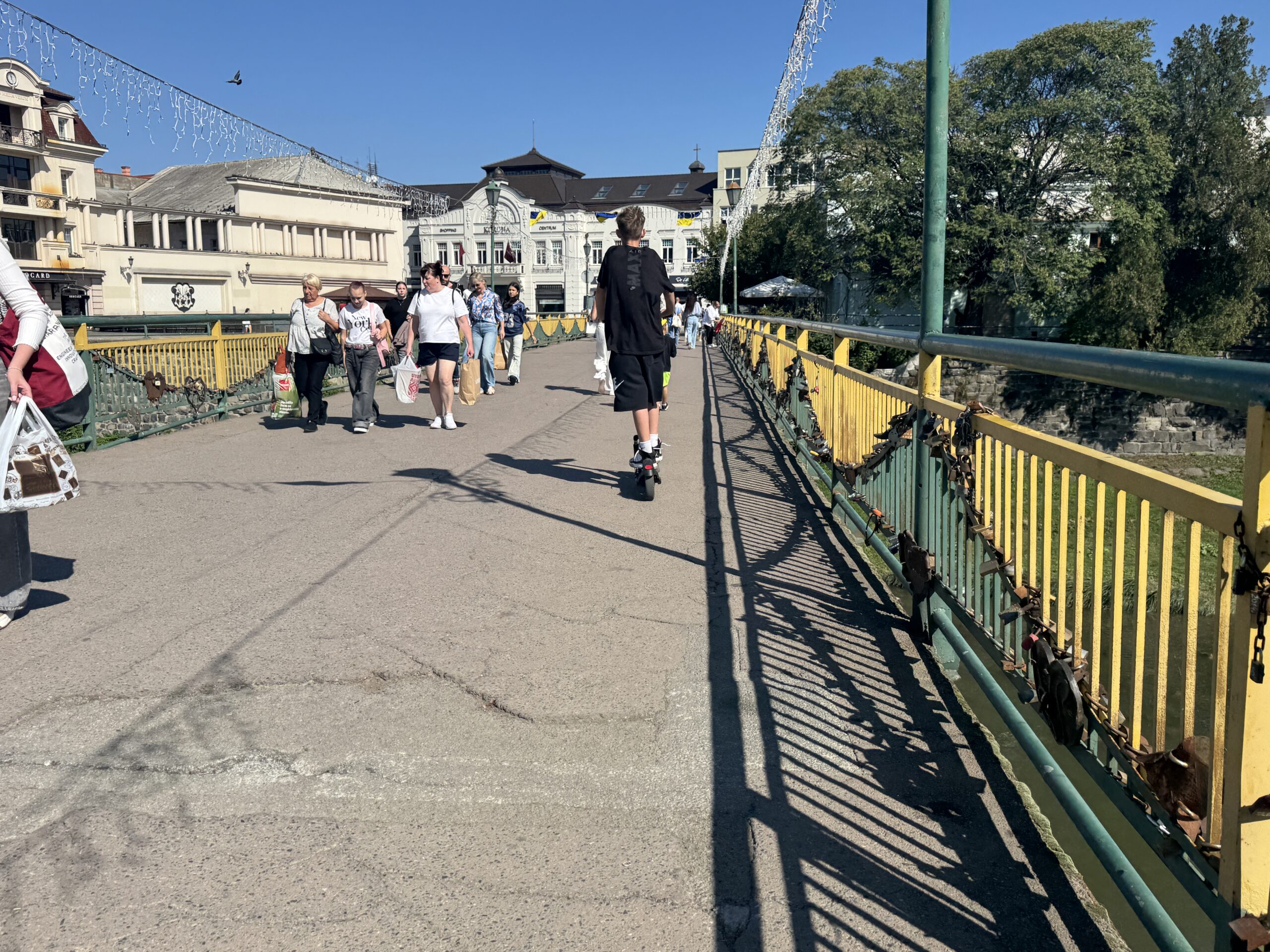Дірки та вибоїни і таке відчуття наче земля з-під ніг йде або хитається. Такий вигляд наразі має один з найвідоміших мостів в Ужгороді. Пішохідний міст є переправою між двома центральними площами. Тут майже завжди багато людей.
