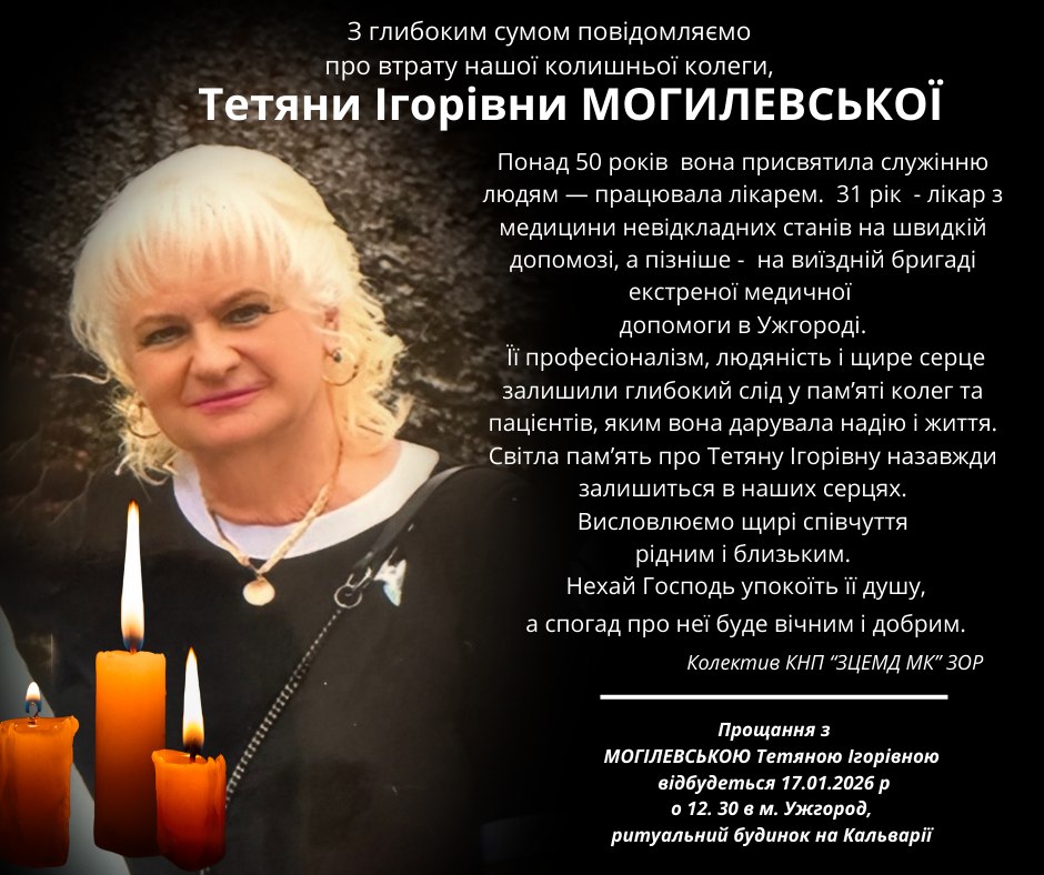 Тетяна Ігорівна понад 50 років служила людям у медицині, з них 31 рік — у службі екстреної допомоги Ужгорода. Колеги згадують її як щиру, людяну та високопрофесійну лікарку, яка дарувала надію й тепло кожному пацієнту.