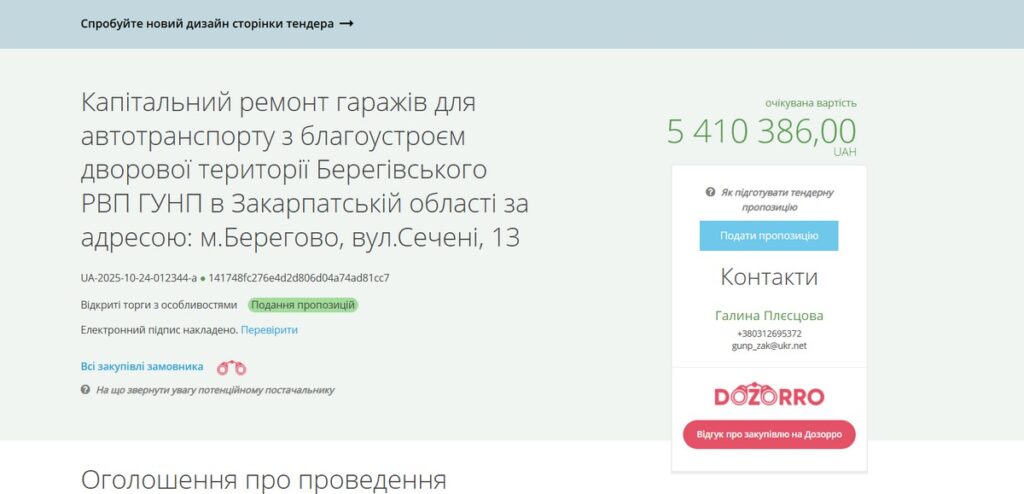 24 жовтня для Берегівського РВП ГУНП оголосили тендер на капремонт гаражів з благоустроєм дворової території. Сума — 5 мільйонів 410 тисяч 386 гривень. Роботи виконати мають до 14 грудня 2026 року.
