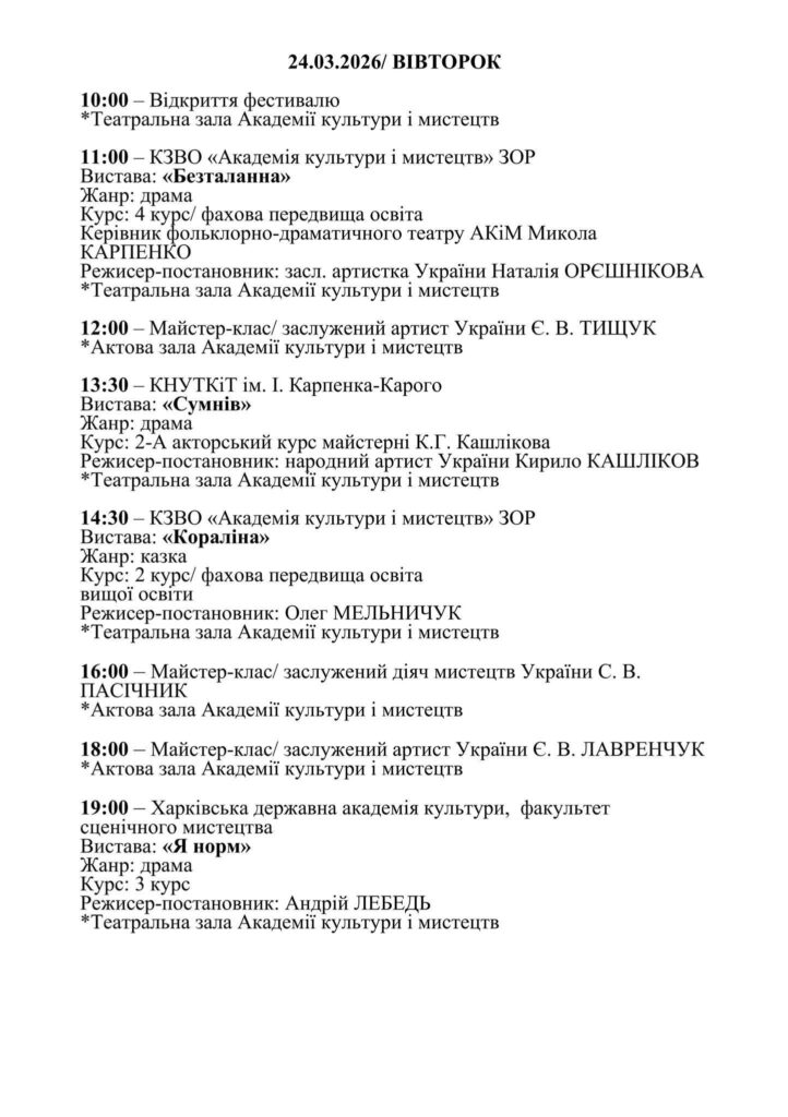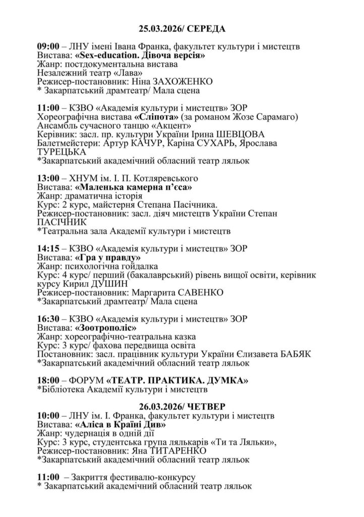 У програмі – десять вистав від студентів провідних мистецьких вишів. Серед них – «Сумнів», «Я норм», «Аліса в Країні Див», «Безталанна», «Кораліна» та інші роботи. Учасники змагатимуться у кількох номінаціях.